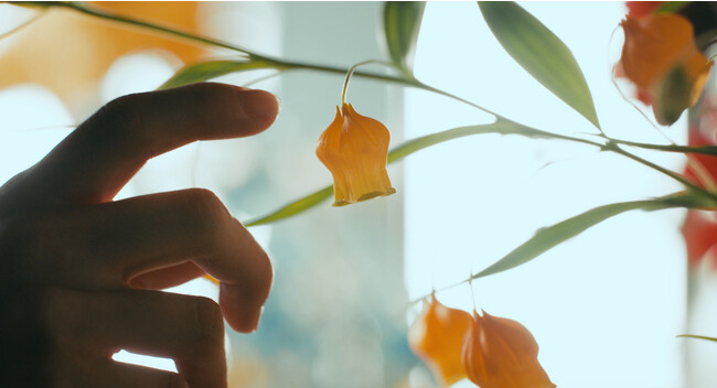 今回解禁された映像は、奈々の日常を台詞無しに描いた本編冒頭の5分。作品内で象徴的に登場するサンダーソニアを購入するシーンから始まり、街を見下ろす高台で手を合わせる姿、自身で営む旅館で働く奈々へと繋がっていきます。幼くして家族を亡くし、誰にも自分の想いを打ち明けずに暮らす彼女の淡々とした日常が叙情的な音楽と共に描写され、本作の世界観が余すことなく表現されています。