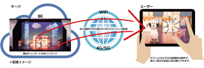 「8Kオペラグラス」は、ミュージカルの舞台やコンサートのステージなどの映像を、スマートフォンやタブレット端末に、on demand で配信する動画配信プラットフォームです。舞台全体の映像から、ユーザーが見たい場所を自由自在に拡大したり、画面をスクロールさせて見ることができます。