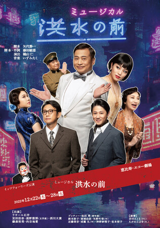 この度、本作、ミュージカル「洪水の前」を、演出に鵜山仁を迎え25年ぶりに再演いたします。主演は作家、演出家としても数々の賞を受賞し、幅広い活躍を続ける稀代のエンターテイナー、ラサール石井。狂言回し役の司会者のほか、フィクサーや軍人など5役に挑戦いたします。ダンスホールの歌姫、徳大寺茉莉役には、シアタークリエのミュージカル「CROSS ROAD〜悪魔のヴァイオリニスト パガニーニ〜」やミュージカル「魍魎の匣」で高評を得たイッツフォーリーズの宮田佳奈が務めます。作家志望の青年、日暮役は文学座の実力派俳優、浅野雅博が、日暮の友人、安東泰男役は「ミス・サイゴン」「レ・ミゼラブル」などミュージカルを中心に活躍する西川大貴を配役するほか、イッツフォーリーズの女性メンバーが華やかにステージを彩ります。