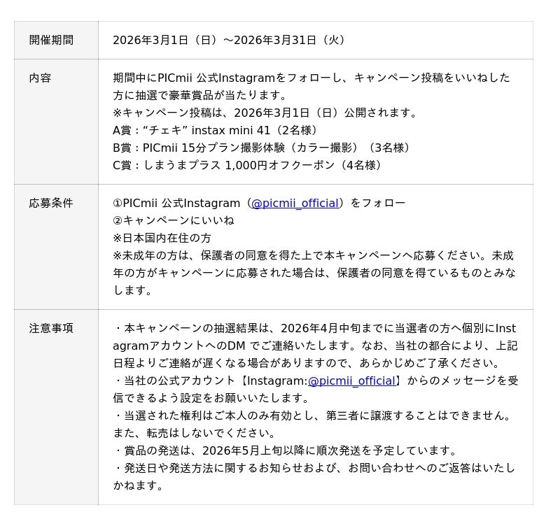 4周年サンクスキャンペーンの第1弾となる本キャンペーンは、PICmiiの公式Instagramをフォローし、該当投稿をいいねしてくださった方の中で抽選で9名様に、SNSで人気の“チェキ”「instax mini 41」やPICmiiの無料撮撮影体験、オリジナルグッズが簡単に作れる「しまうまプラス」の1,000円オフクーポンなどの豪華賞品をプレゼントいたします。この機会にぜひご応募ください。