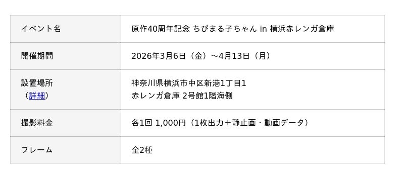 キタムラ・ホールディングス グループのピックハイブ株式会社(本社:東京都新宿区、代表取締役社長 兼 COO:大迫 由典)が運営するセルフフォトブランド「Photomatic(読み:フォトマティック)」は、2026年3月6日(金)〜4月13日(月)までの期間、「ちびまる子ちゃん」の原作40周年を記念したオープニング企画「原作40周年記念 ちびまる子ちゃん in 横浜赤レンガ倉庫」とコラボレーションしたオリジナルフレームをPhotomatic 横浜赤レンガ倉庫で限定発売します。
