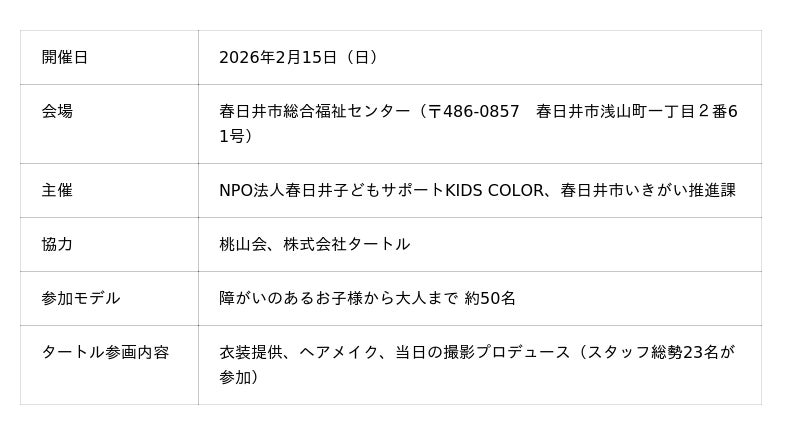 東海地方で25店舗のフォトスタジオを運営する株式会社タートル(本社:愛知県春日井市、代表取締役社長:亀山直樹)は、2026年2月15日、春日井市総合福祉センターにて開催されたファッションショー(主催:NPO法人春日井子どもサポートKIDS COLOR、春日井市いきがい推進課/協力:桃山会、(株)タートル)において、衣装提供、ヘアメイク、および撮影の行程をプロデュースいたしました。