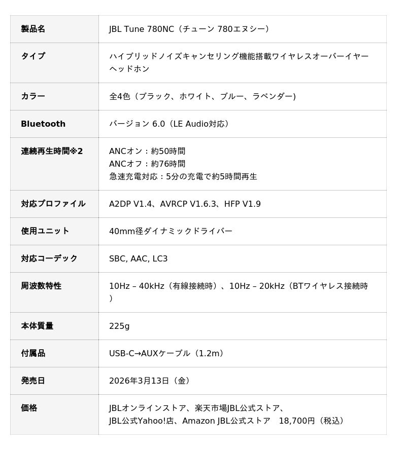 ハーマンインターナショナル株式会社(本社:東京都千代田区、代表取締役:桑原拓磨)は、アメリカ カリフォルニア発祥の世界最大級のオーディオブランドであり、日本においてワイヤレススピーカー8年連続販売台数No.1※1に輝く「JBL」から、ワイヤレスオーバーイヤーヘッドホン「JBL Tune 780NC」を2026年3月13日(金)よりJBLオンラインストア、JBL公式楽天市場店、JBL公式Yahoo!店およびAmazon JBL公式ストアにて限定発売いたします。