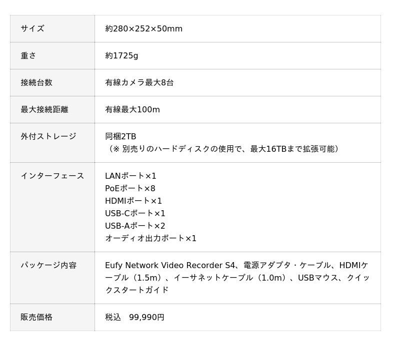 ※1 「Eufy PoE Cam E41」を1台使用した場合、「Eufy PoE Cam S4」を1台使用する場合は約21日分保存可能(別売りのハードディスクの使用で、最大16TBまで拡張可能)