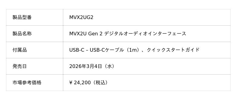 MVX2U Gen 2デジタルオーディオインターフェースは、本日3月4日より発売いたします。製品には、1メートルのUSB‑C - USB‑Cケーブルとスタートガイドが付属します。