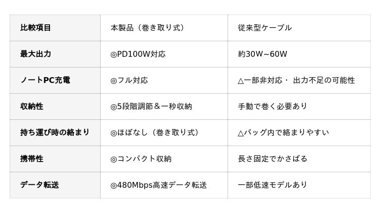 テレワークや外出先での作業が一般化する中、モバイル環境の整備は重要な課題となっています。しかし従来のケーブルは「絡まる」「長くてかさばる」「出力が不足する」といった不満が多く、持ち運びと性能の両立が求められていました。特にノートPC充電に対応できる高出力モデルへの需要は急速に拡大しています。
