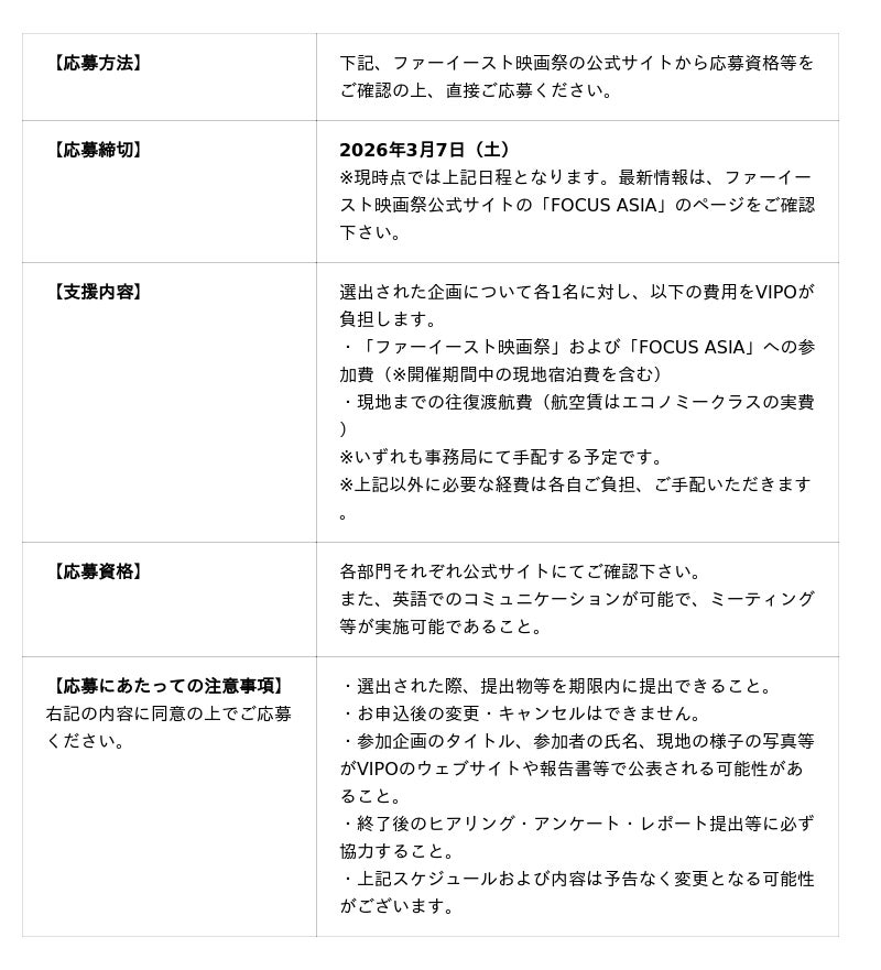締切後、日本からの応募者についてVIPOおよび「ファーイースト映画祭」事務局にて選考を行い、支援候補者2名を決定いたします。
